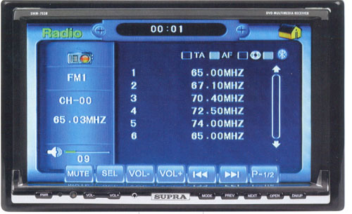 В настроечном меню лишь выбор региона вещания для тюнера и калибровка сенсорного экрана. Пользовательский интерфейс русский, но если вы в меню Setup DVD-плеера выберете язык меню, скажем, английский, то и общаться с вами аппарат станет уже на нём. Не очень понравилось то, как спешно Supra выходит из настроек звука или изображения — замешательства на 3,5 с достаточно, чтобы входить в режим пришлось повторно.